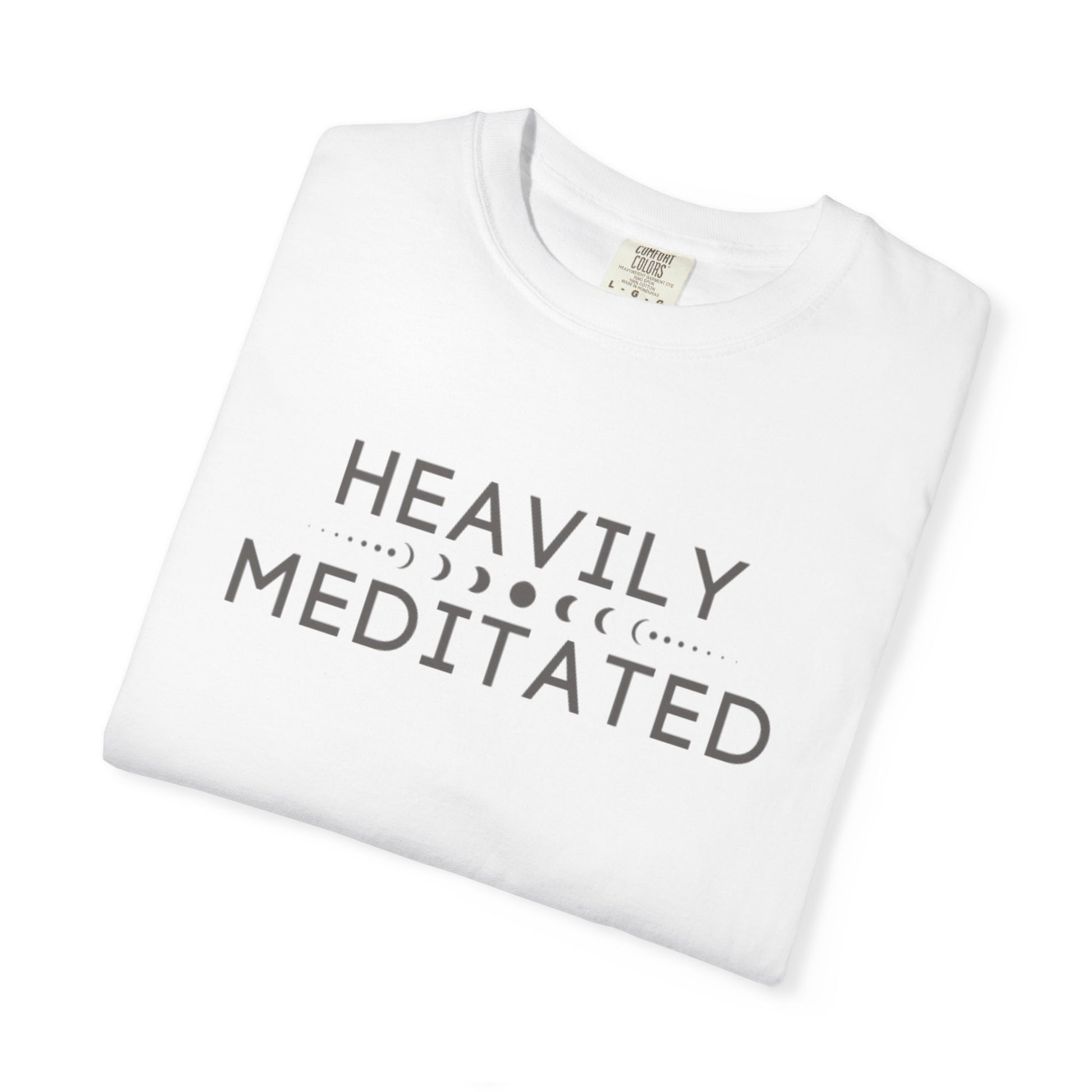 "Heavily Meditated" printed directly onto a Comfort Colors garment dyed t-shirt.