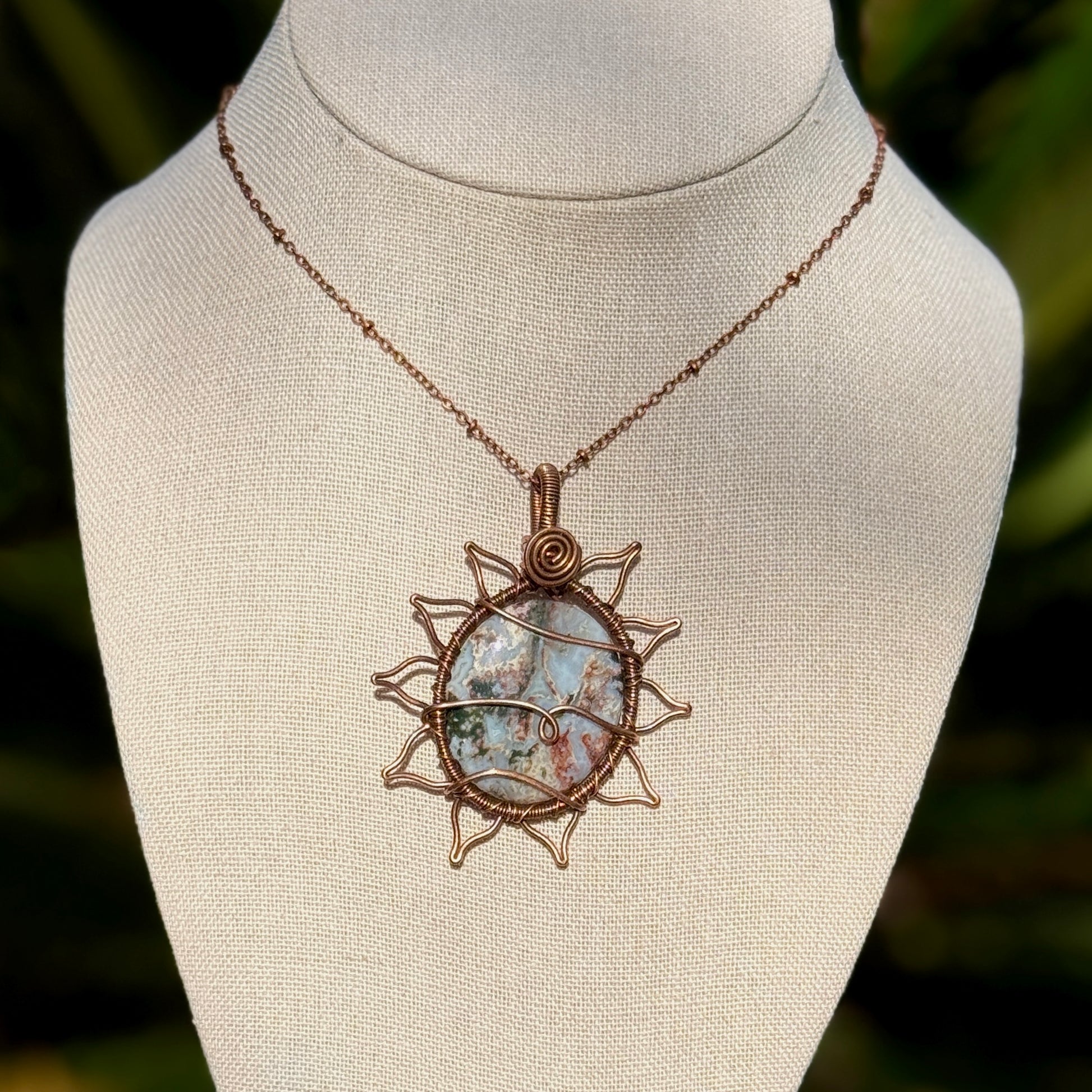 Moss agate wrapped in a flower design. Made with pure copper wire that’s been oxidized to a perfect antique copper finish.