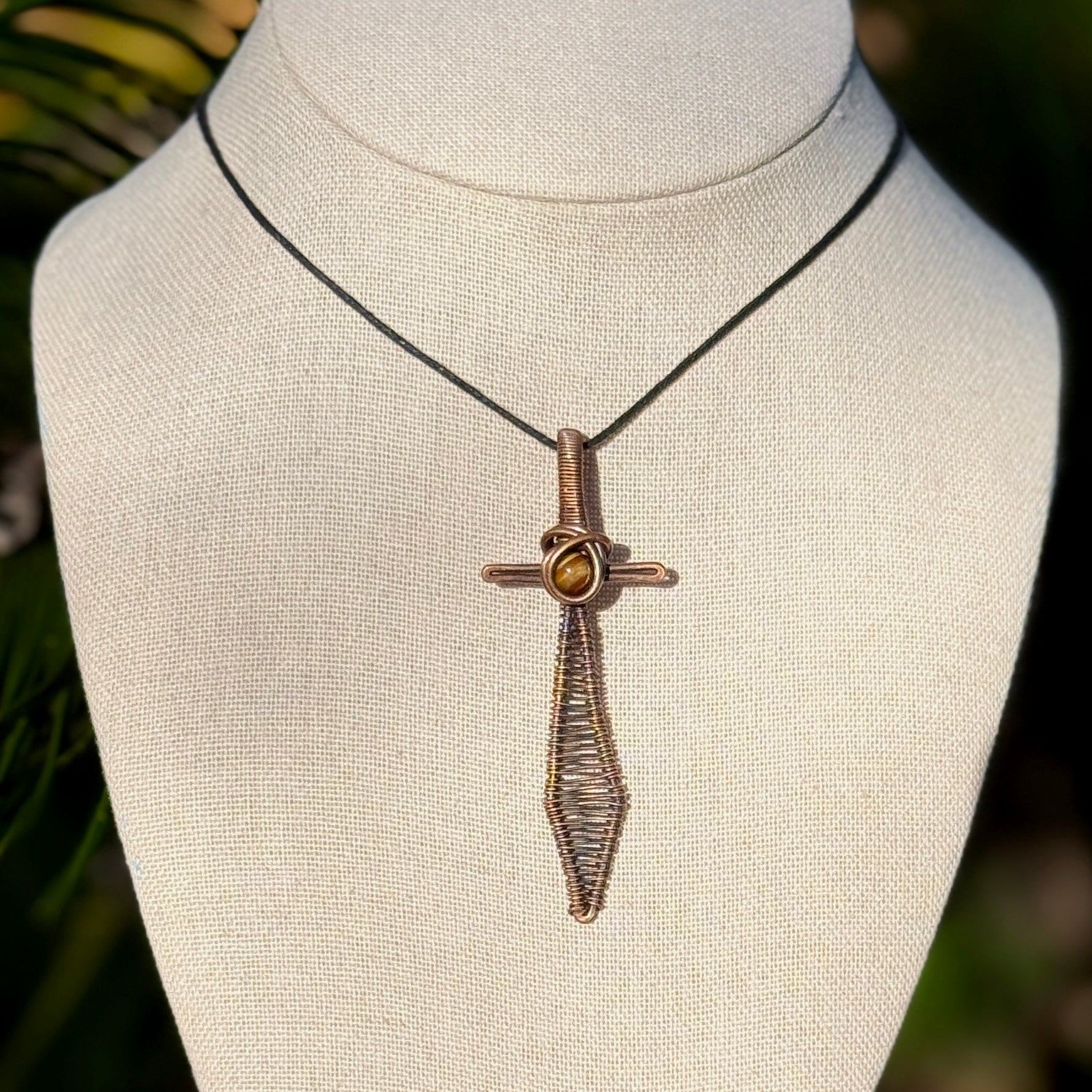 Tigers eye wrapped in a sword design. Made with pure copper wire that’s been oxidized to a perfect antique copper finish.