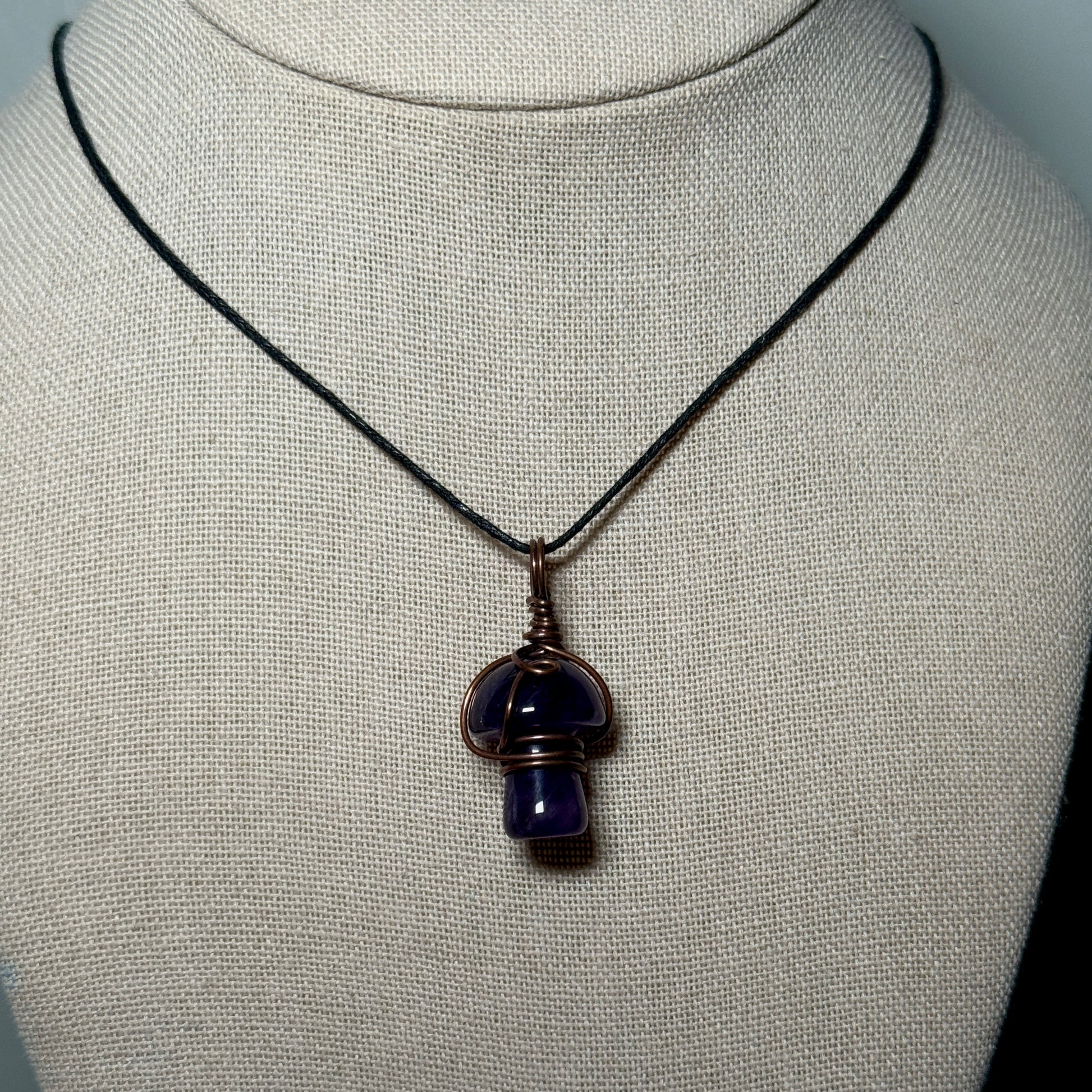 Amethyst mushroom wrapped with pure copper wire that’s been oxidized to a perfect antique copper finish.