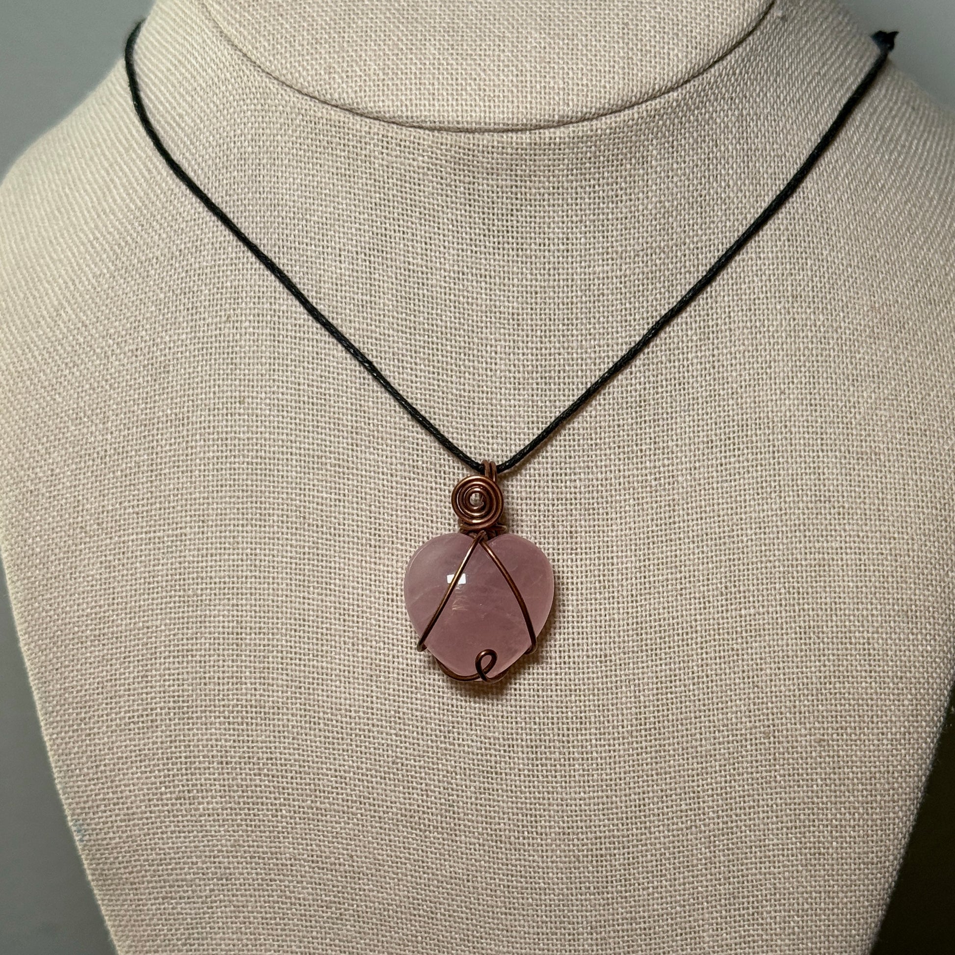 Rose Quartz heart wrapped with pure copper wire that’s been oxidized to a perfect antique copper finish.