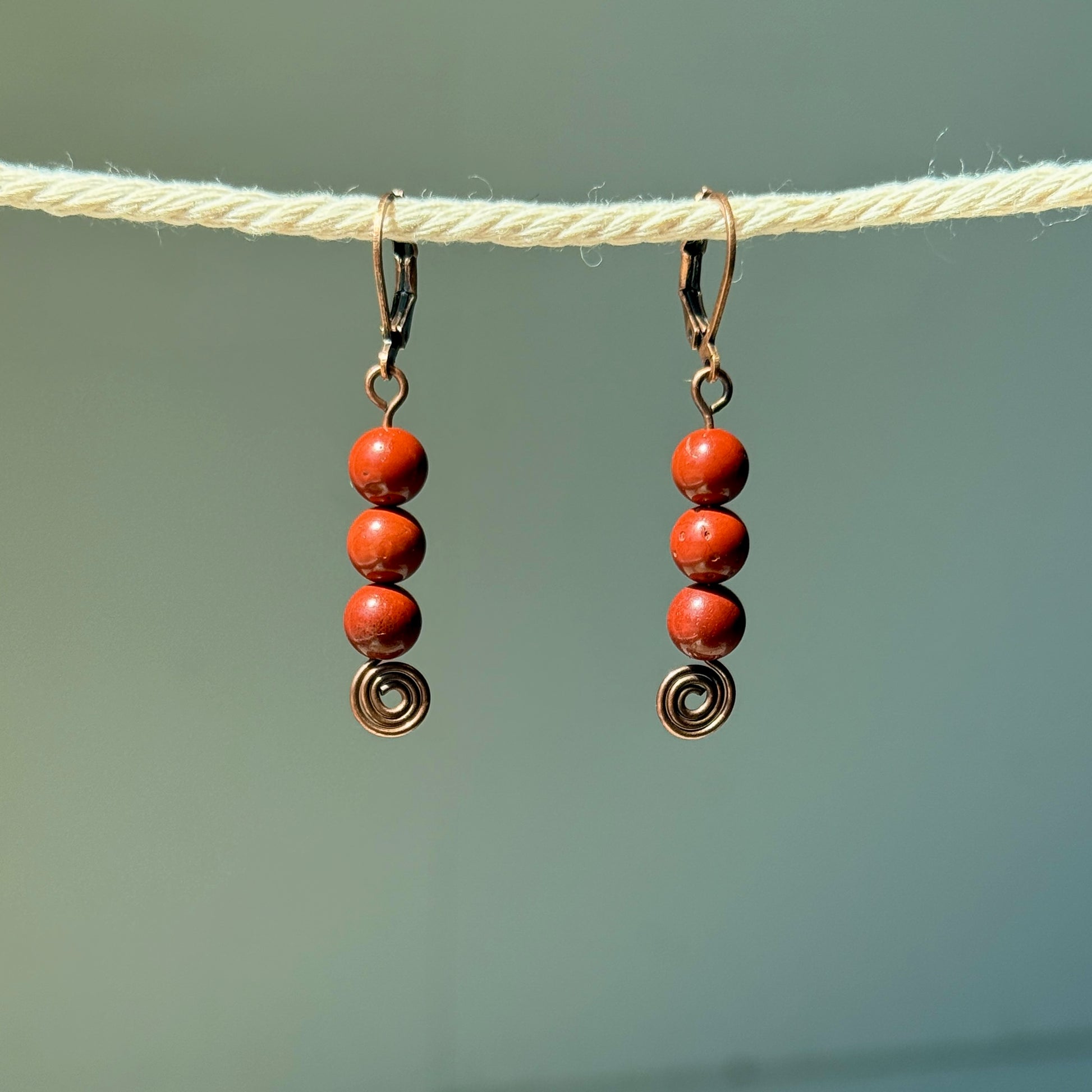 Red Jasper earrings with a swirl at the end. Made with pure copper wire that’s been oxidized to a perfect antique copper finish.
