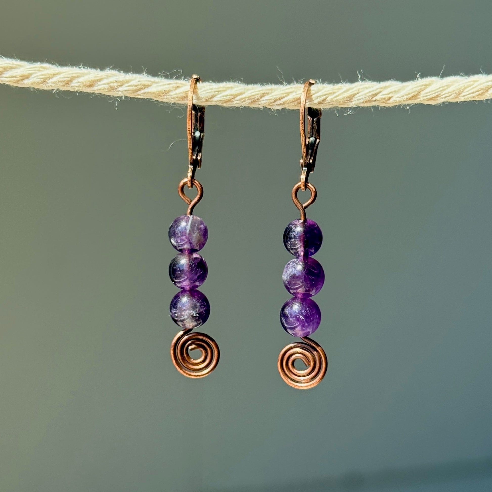 Amethyst earrings with a swirl at the end. Made with pure copper wire that’s been oxidized to a perfect antique copper finish.