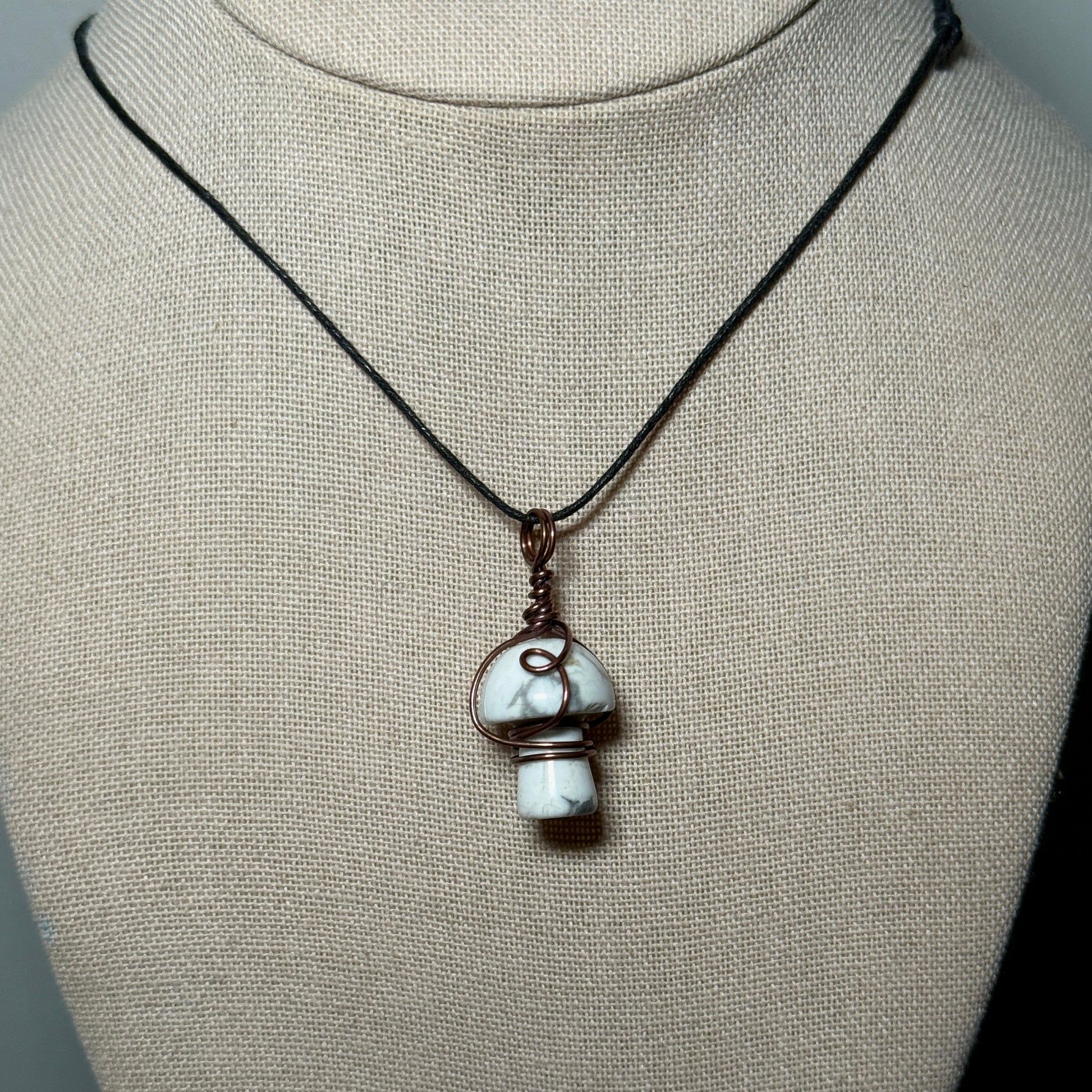 Howlite mushroom wrapped with pure copper wire that’s been oxidized to a perfect antique copper finish.