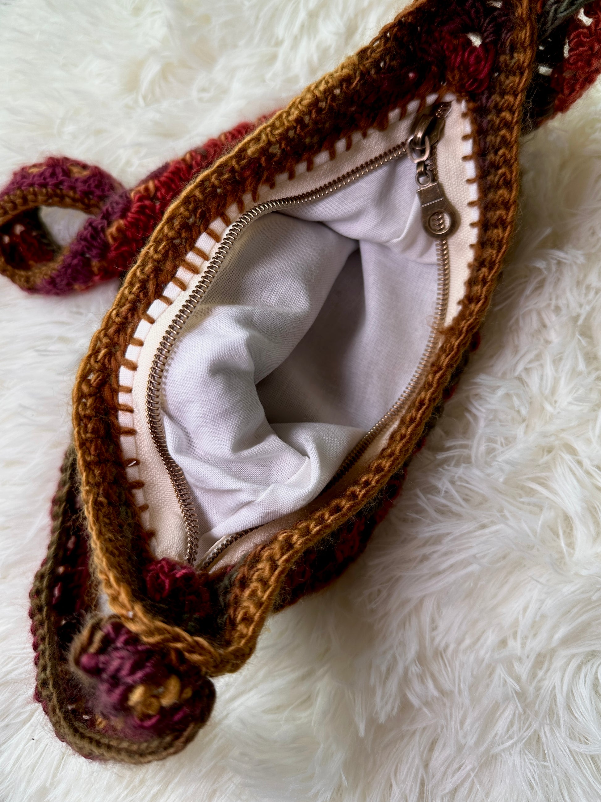 Handmade crochet crossbody bag. Made with 100% acrylic yarn and fully lined with 100% cotton fabric. Zipper closure