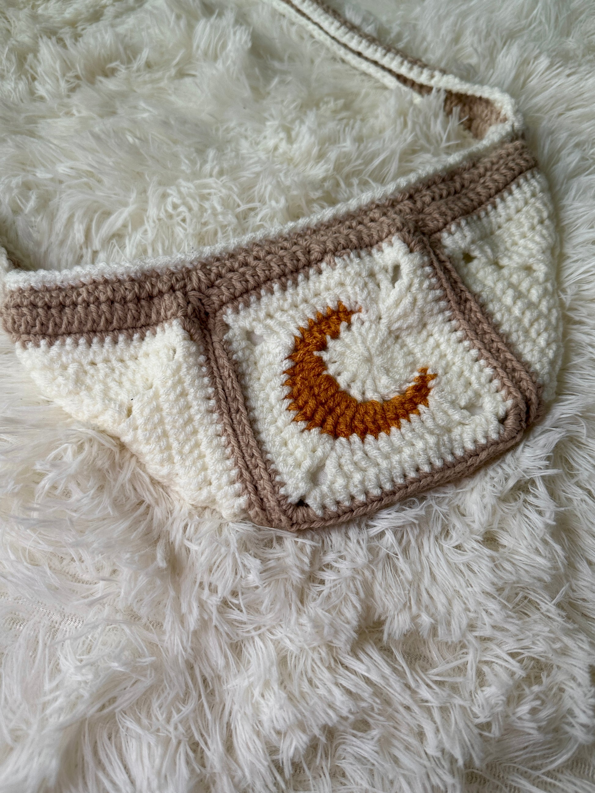 Handmade crochet crossbody bag featuring a sun and moon motif. Made with 100% acrylic yarn and fully lined with 100% cotton fabric. Zipper closure