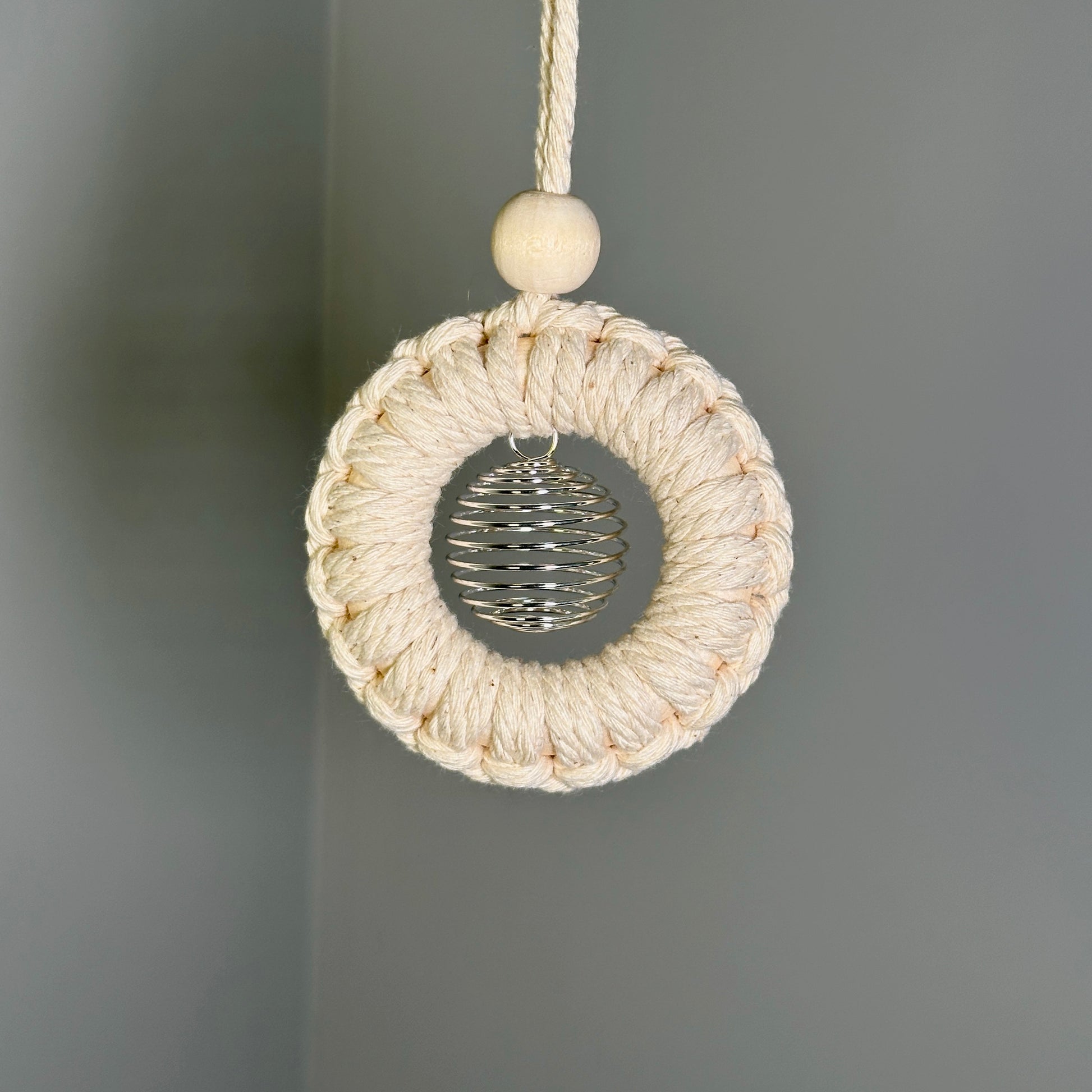 Macrame rearview mirror hanger. Comes with a 2” binder ring to easily hook onto mirror. Includes an intuitively chosen tumbled crystal.