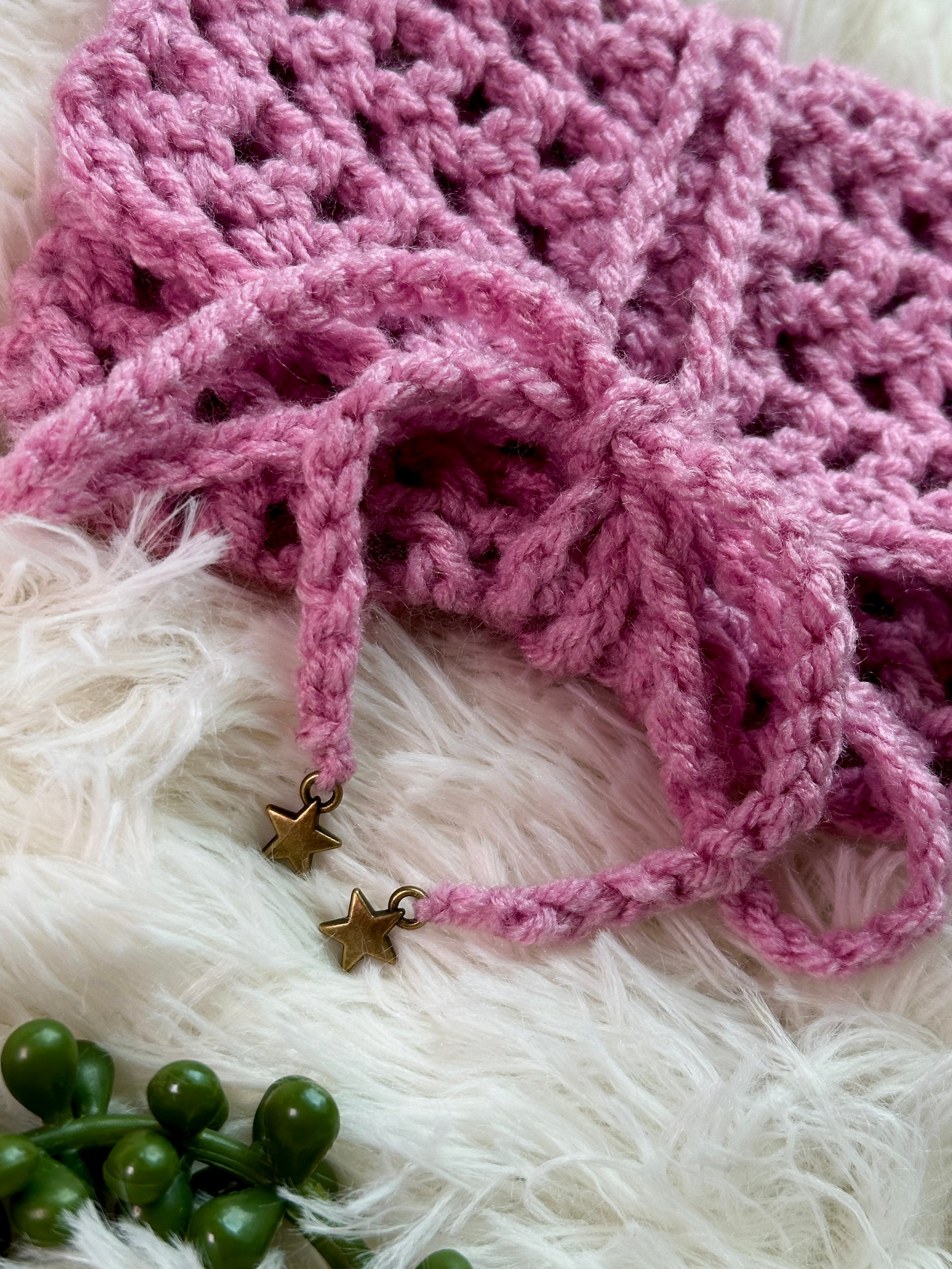 Handmade crochet tarot pouch. Tie closure featuring brass star charms.