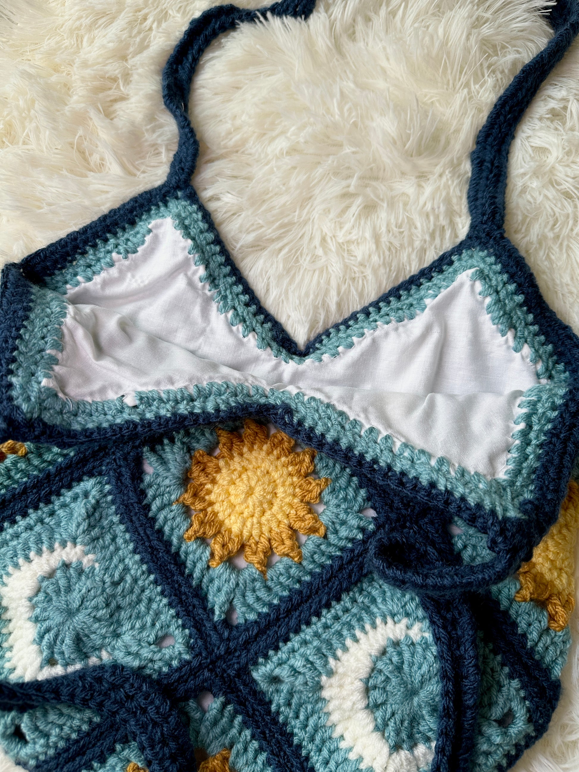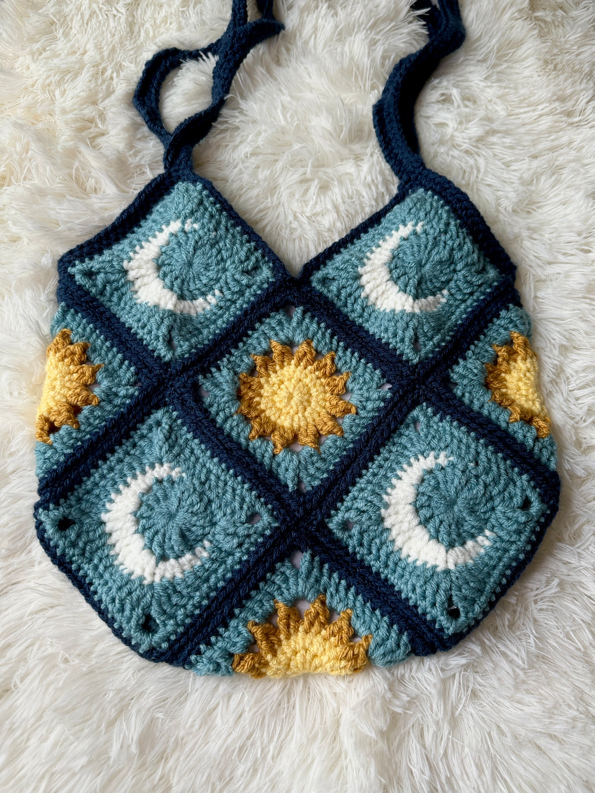 Handmade crochet tote bag featuring sun and motif. Made with 100% acrylic yarn and fully lined with 100% cotton fabric.